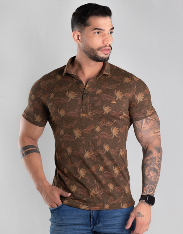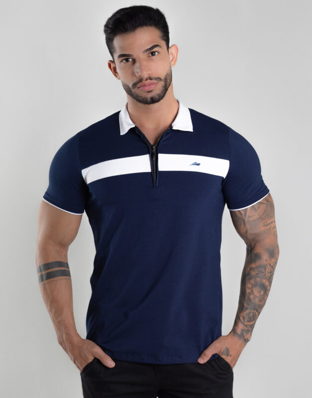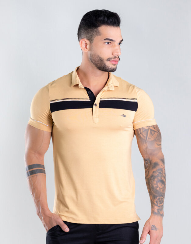 Gola Polo Masculina na Malha Orgânica 68% Algodão 32% PUE , com Estampa de listra e detalhes de estrelas na Frente.